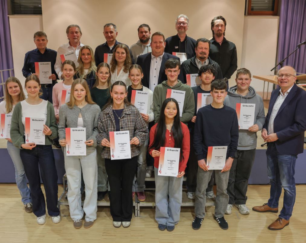 Während der Ehrungen des Stadtsportverbandes Delbrück für erfolgreiche Mannschaften und Sportler/innen des Jahres 2025, nahmen Julian Thewes (hintere Reihe 3. v. r.) für die Fußballer der SG Boke/Bentfeld und Michael Lefeld (hintere Reihe 2. v. r.) für den Bogenschützen David Strodick stellvertretend die Auszeichnungen im Empfang.