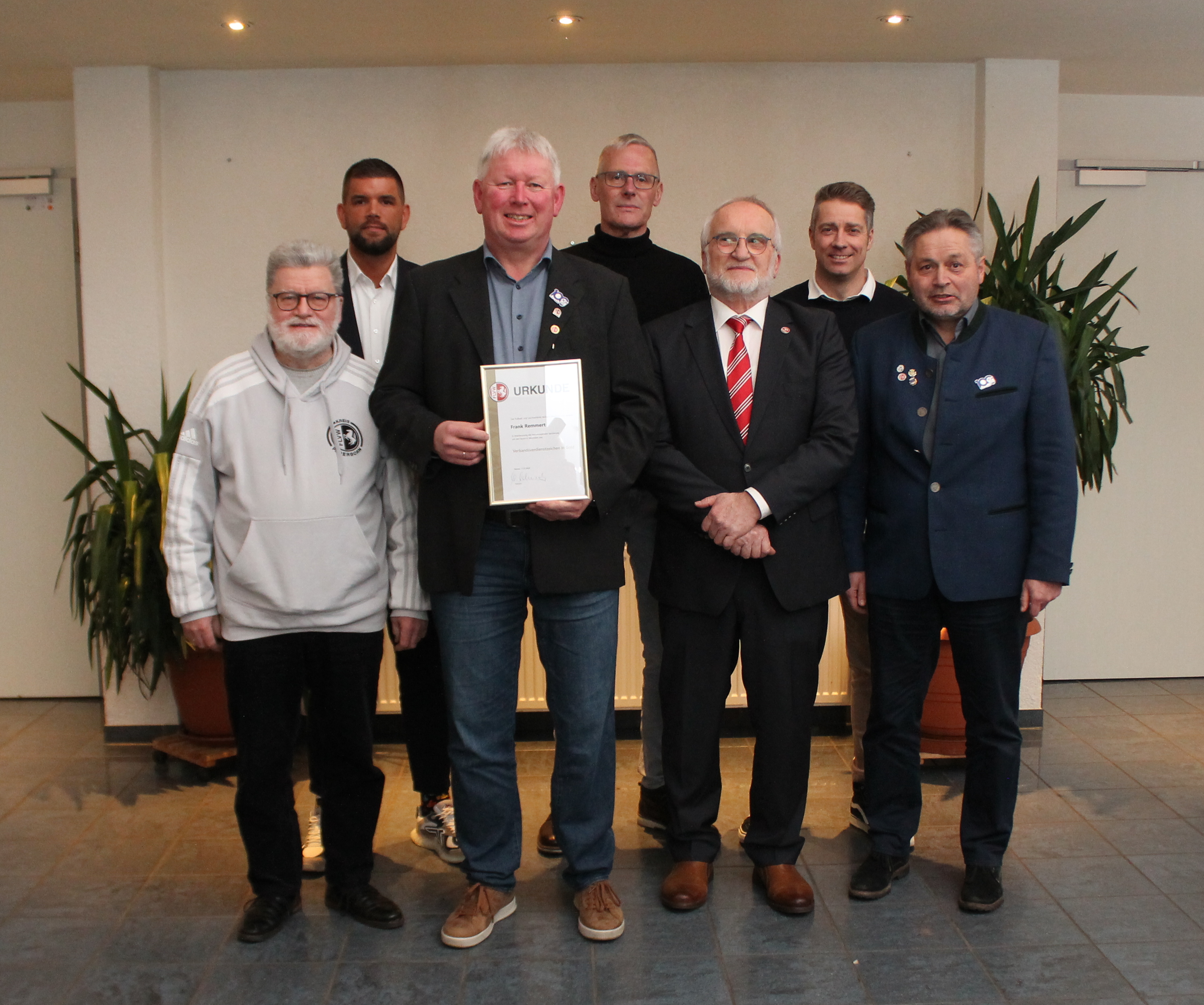 Auszeichnung für über 25 Jahre im Amt des Geschäftsführers des SuS BOKE 1924 e.V. Der FLVW-Vorsitzende Dietmar Ape (3. von links) überreichte Frank Remmert das Verdienstabzeichen in Gold. Erste Gratulanten waren der Ehrenamtsbeauftragte des FLVW Josef Höwelkröger (von links), der neu gewählte Fußball-Vorsitzende Torben Enriquez Vega, der Ehrenamtsbeauftragte des SuS BOKE Norbert Schröder, der bisherige Fußball-Vorsitzende Mike Jochem und der Vorsitzende des SuS BOKE Martin Thewes.