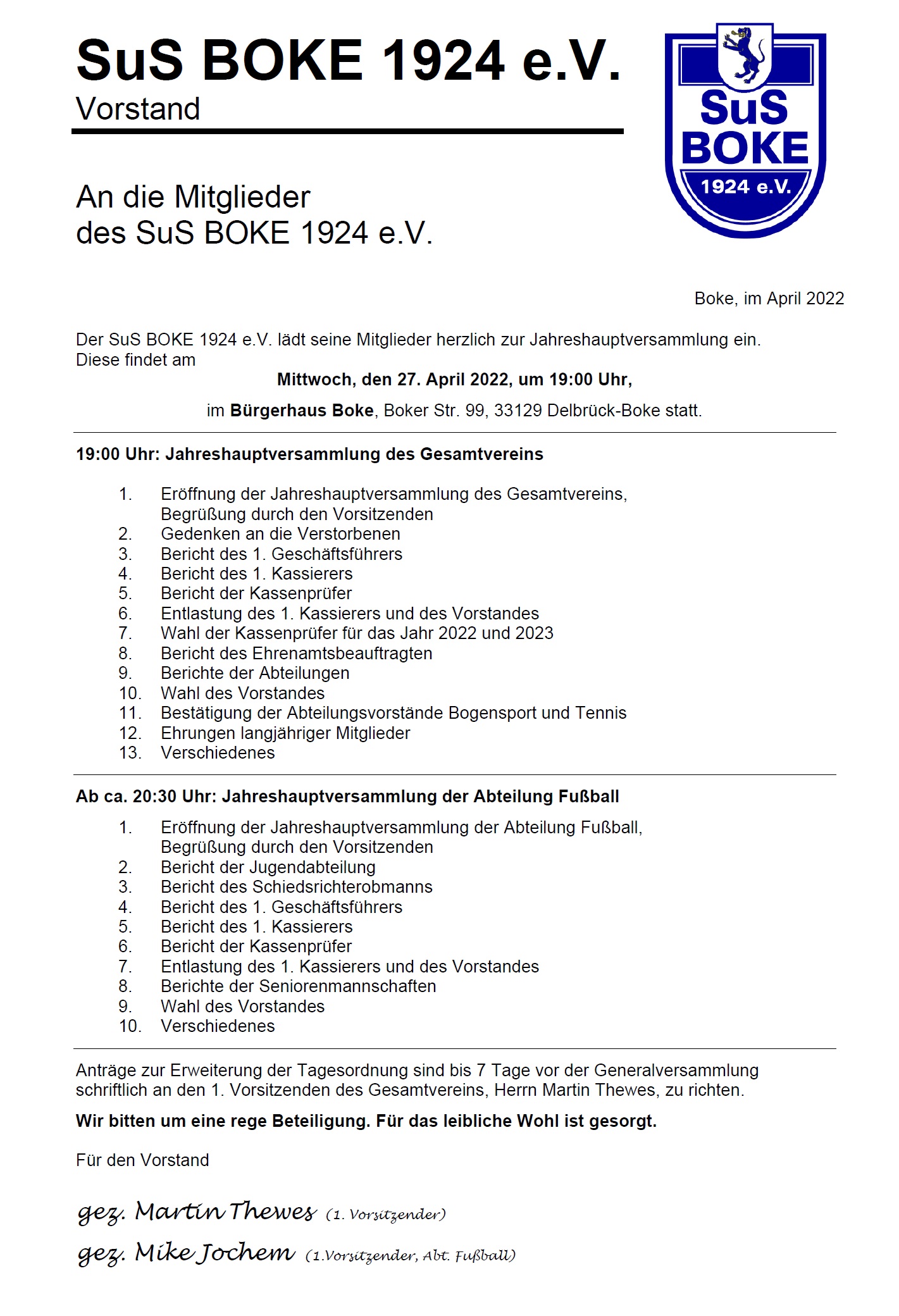 Einladung zur Jahreshauptversammlung am Mittwoch, den 27. April 2022