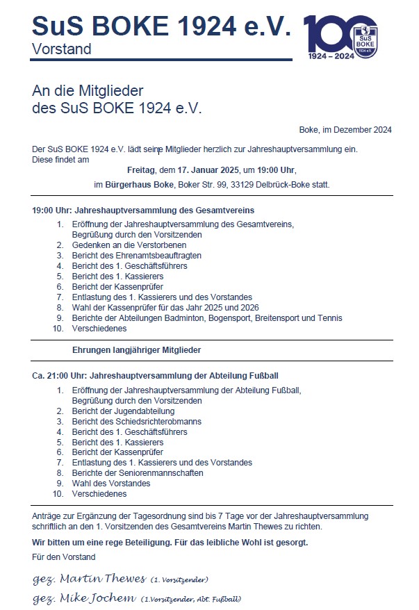 Zu den Jahreshauptversammlungen des Gesamtvereins und der Abteilung Fußball lädt der Vorstand des SuS BOKE 1924 e.V. am Freitag, dem 17. Januar 2025 in das Bürgerhaus Boke ein.