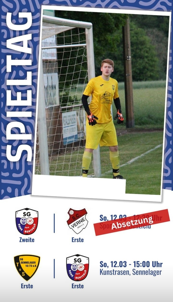 Die Spiele unserer II. und III. Mannschaft werden aufgrund der aktuellen Platzverhältnisse auf einen späteren Zeitpunkt verlegt. Die Dritte spielt am 23. März 2023 bei der SG Scharmede/Thüle III. Das Spiel der Reserve gegen RW Verne wurde noch nicht terminiert.
