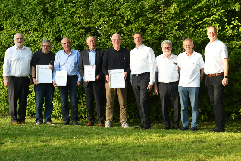 Im Amt bestätigter FLVW-Vorsitzender Dietmar Ape (v.l.), Walter Olma (FLVW Ehrenzeichen in Gold), Karl-Heinz Zornow (DFB-Verdienstnadel), Erich Drotleff (Kreisehrennadel), Ulrich Wieseler (FLVW Ehrenzeichen in Gold), Frank Blasek, Josef Höwelkröger (DFB-Verdienstnadel), Martin Wegener (FLVW Ehrenzeichen in Silber), Vorsitzender des DFB-Jugendausschusses Holger Bellinghoff. Foto: FLVW Paderborn.