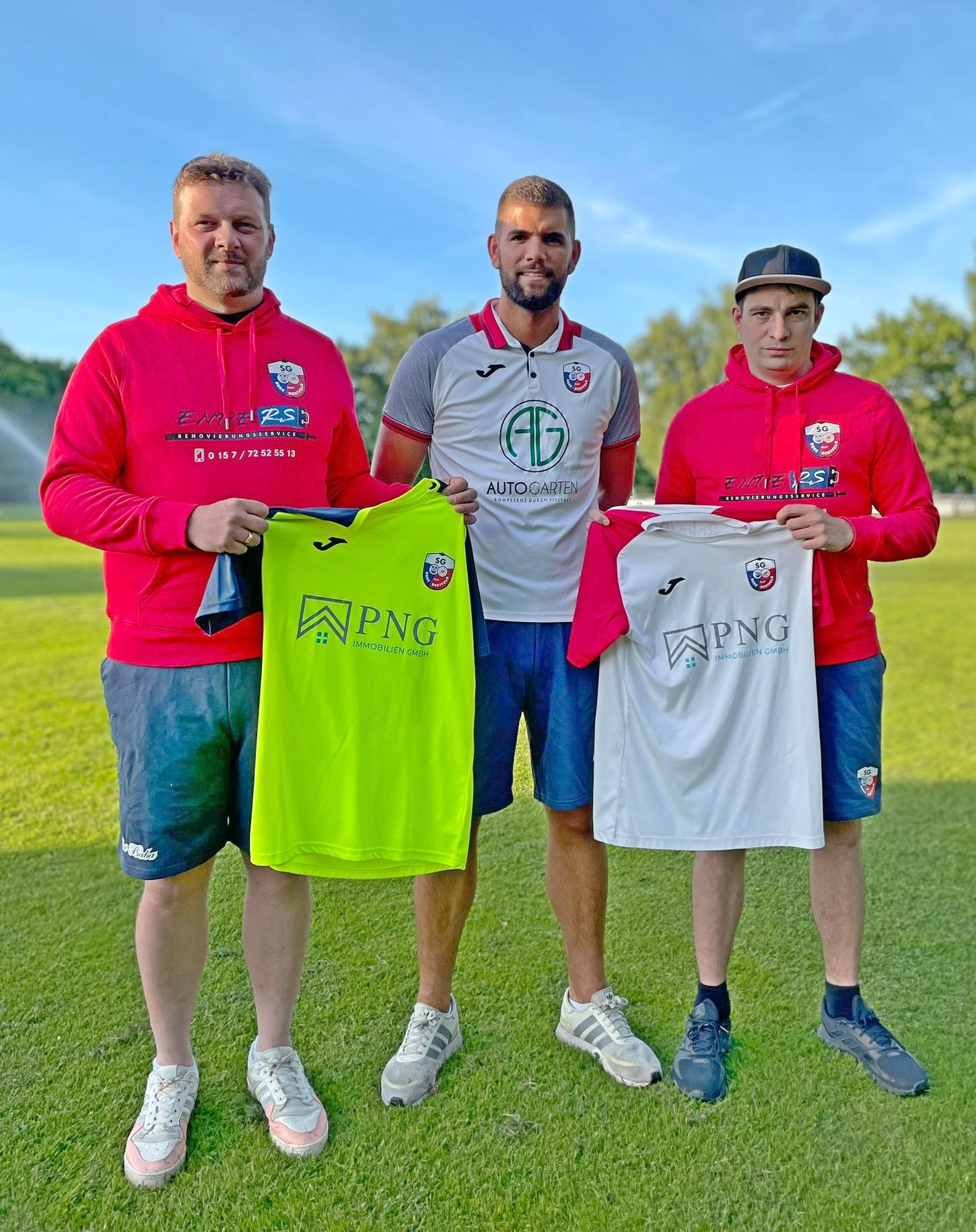 Fußball-Obmann Torben Enriquez Vega begrüßt das neue Trainer-Team Dominik Reuter (r.) und Rafael Glomb (l.).
