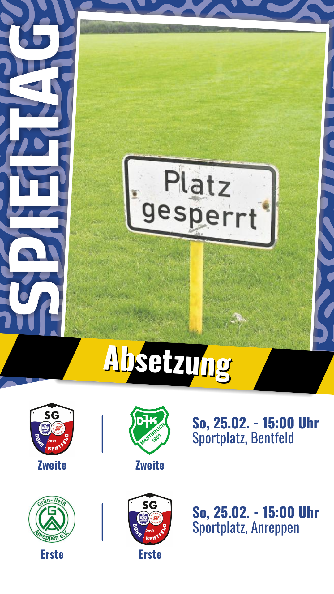 Topspiel bei GW Anreppen und Spiel der Reserve gegen DJK Mastbruch II abgesagt.