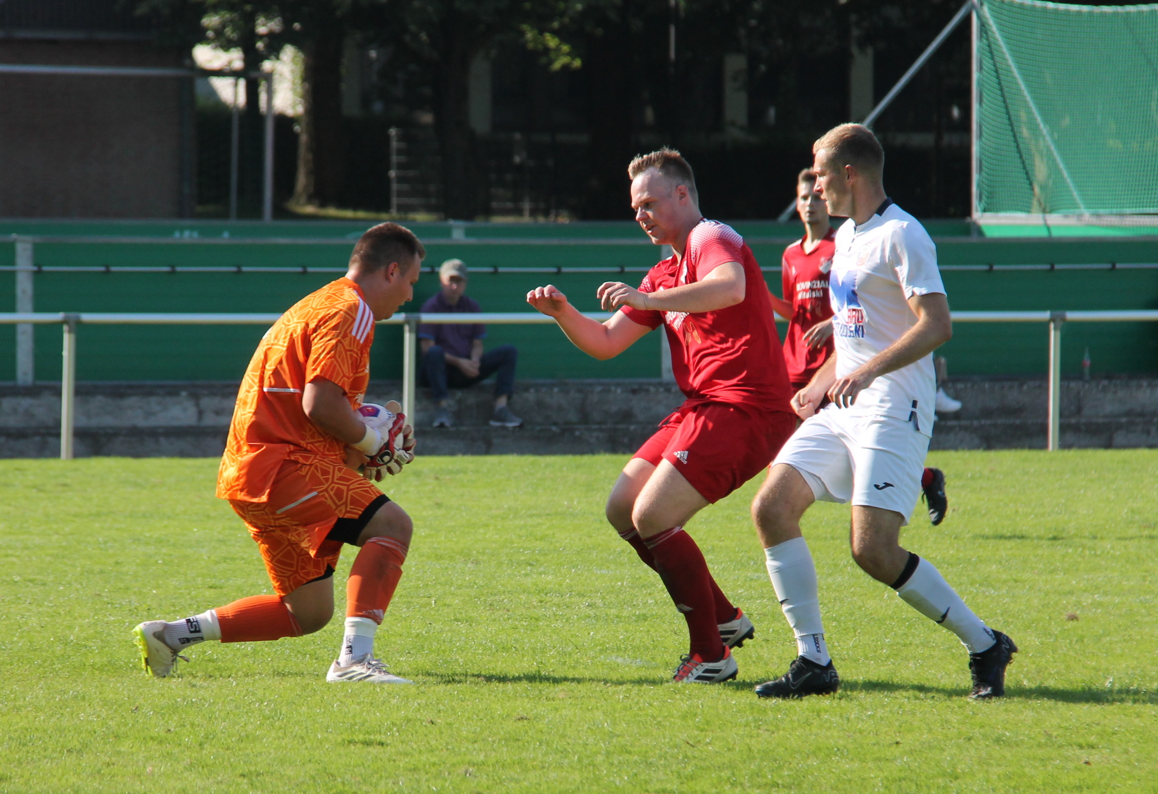 Doch nach einer Ecke kamen die Gastgeber in der 12. Minute durch Jonas Rogg zum 1:1. Danach sahen die Zuschauer bei hochsommerlichen Temperaturen eine nur mäßige Leistung unseres Teams. Bezeichnend für den Auftritt der SG war der nächste Treffer der Rot-Weißen. Eine zu kurz gespielte Rückgabe auf Torwart Max Vlachos verwandelte Marvin Weber direkt nach dem Seitenwechsel zum 2:1.