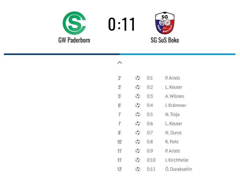 Gegen den SC Grün-Weiß Paderborn brannte die SG schon zwei Tage vor dem Jahreswechsel ein Feuerwerk ab. Nach 12 Minuten hieß es 11:0 gegen den B-Ligisten vom Paderborner Fürstenweg. Neun Schützen trugen sich dabei in die Torjägerliste ein: Paul Artelt und Laurenz Keuter jeweils zweimal sowie Aaron Wilmes, Johannes Krämmer, Niklas Troja, Niklas Dunst, Torwart Ron Pohl, Julian Kirchhelle und Ömer Duraksahin.