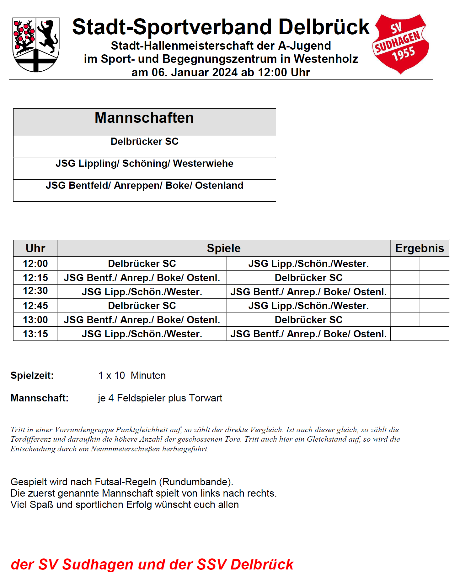 In jeweils zwei Begegnung à 10 Minuten treffen die JSG Bentfeld/Boke/Anreppen/Ostenland, die JSG Lippling/Schöning/Westerwiehe und der Delbrücker SC aufeinander.