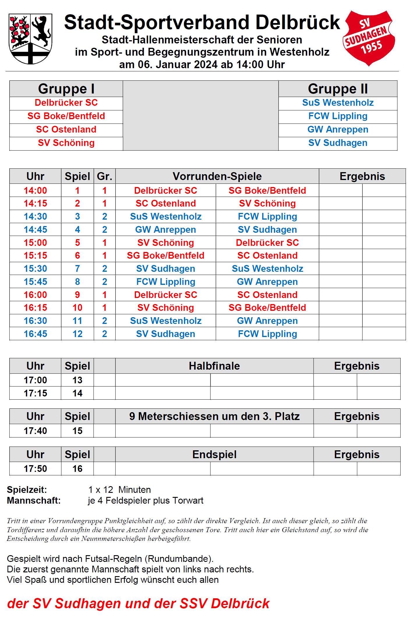 Acht Seniorenteams stehen sich am 6. Januar 2024 ab 14:00 Uhr in zwei Vorrundengruppen gegenüber. In der Gruppe 1 treffen die SG Boke/Bentfeld, der Delbrücker SC, der SC Ostenland und der SV Schöning aufeinander. In der Gruppe 2 spielen der SV GW Anreppen, der FCW Lippling, der SV Sudhagen und der SuS Westenholz.