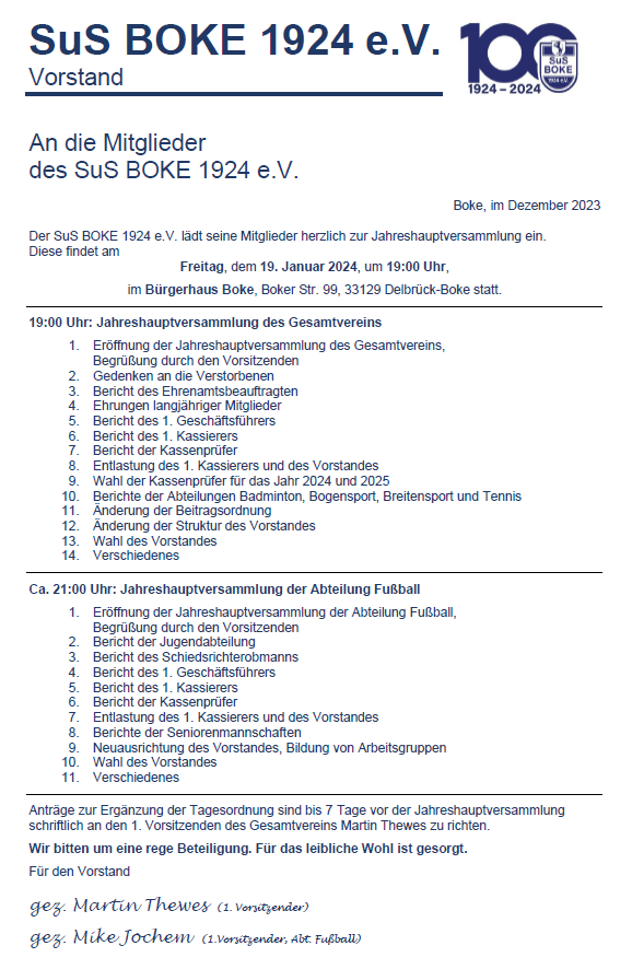 Zu seiner Jahreshauptversammlung des Gesamtvereins lädt der Vorstand des SuS BOKE 1924 e.V. seine Vereinsmitglieder ein.
