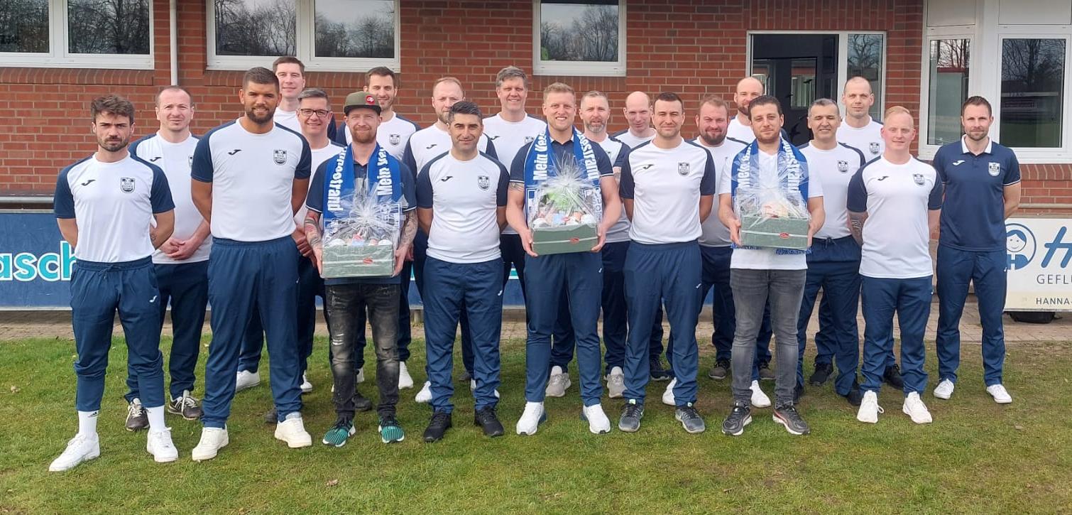 In dunkelblauen, elegant-sportlichen Trainingsanzügen gibt das Team vor und nach den Spielen ein einheitliches Mannschaftsbild ab. Für das gute Aussehen der Spieler sorgte Dennis Volkmer, rechts mit Fanschal, Inhaber des Dorfmarktes Boke.