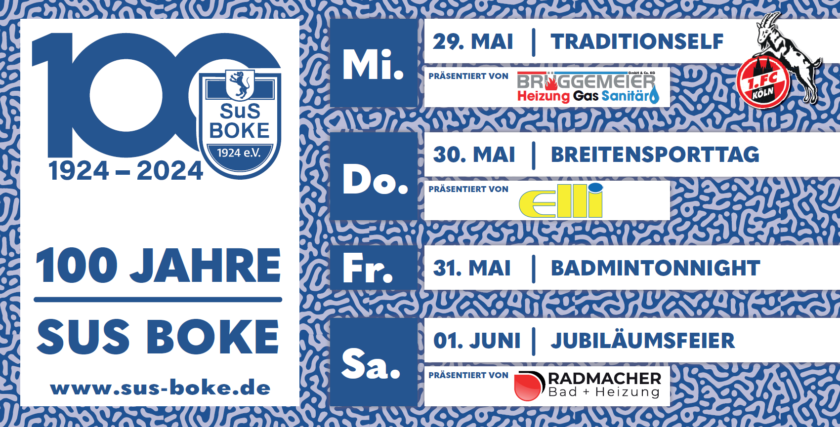 Jubiläumsveranstaltungen des SuS BOKE vom 29. Mai bis 1. Juni 2024